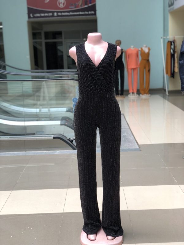 Sleeve-less sexy black jumpsuit with shinny stripes